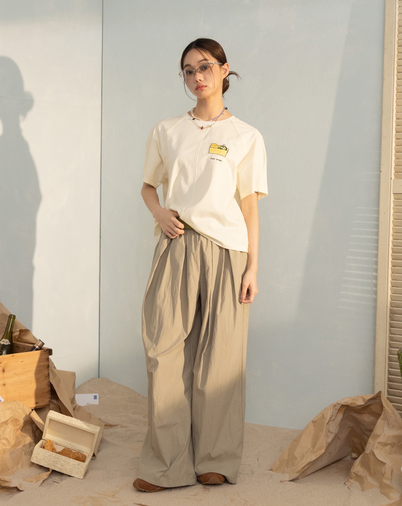 口袋框車線透氣鬆緊打褶寬褲(兩色)